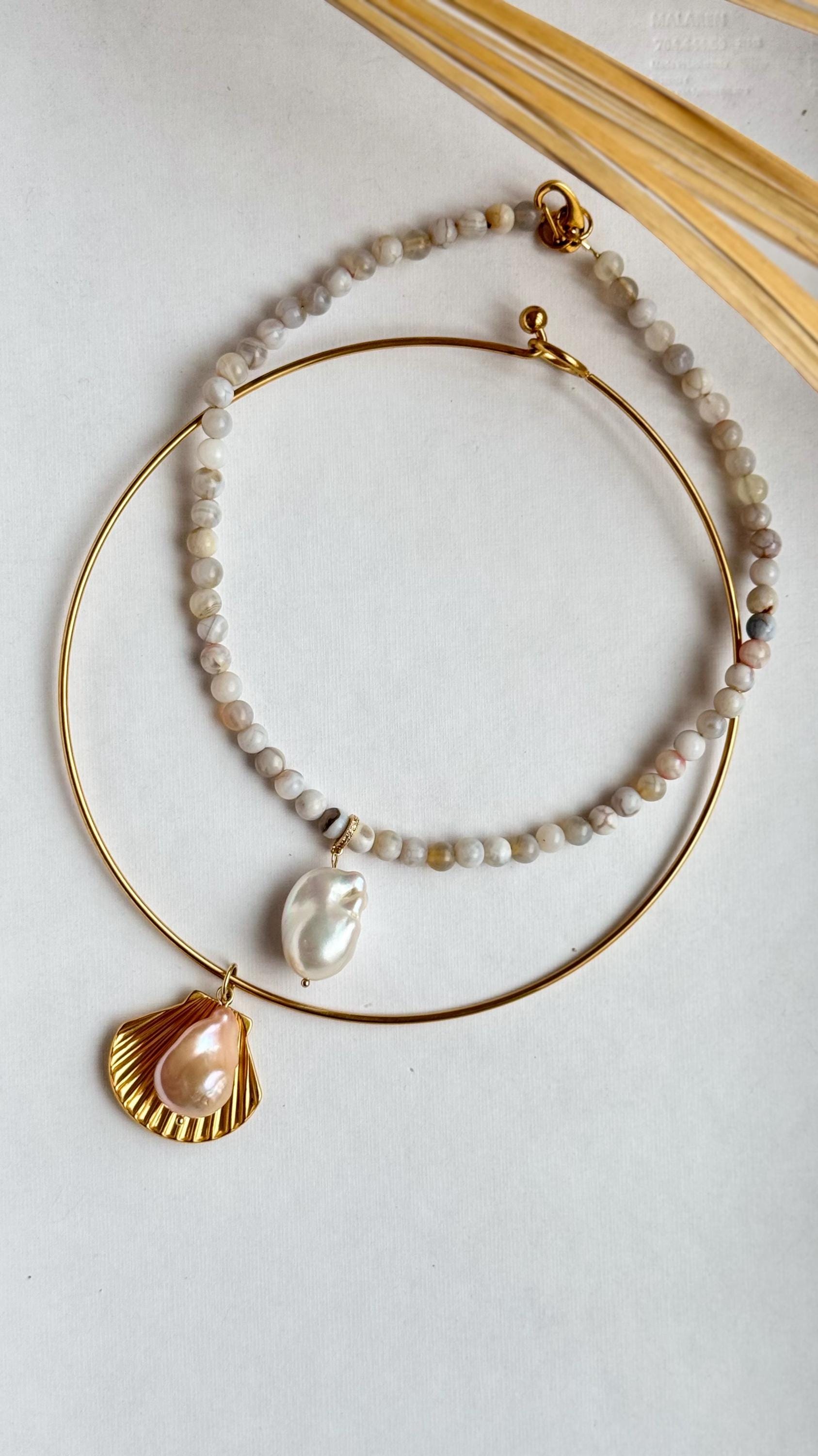 Schlichter Reifen in 18 Karat Vergoldung und wasserfest mit einer natürlichen Barockperle in rosé und einem super praktischem Verschluss.