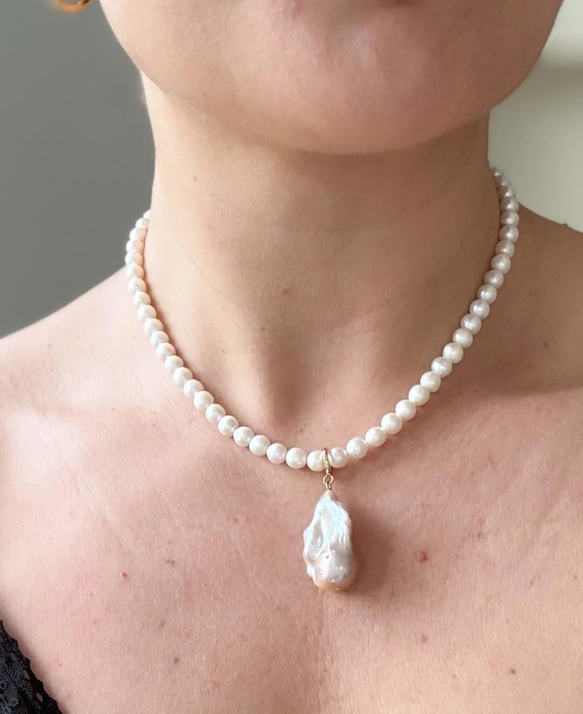 Natürliche Süsswasserperlen mit einer Barockperle. 18 Karat vergoldet